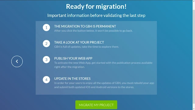 هنا يخبرك انه لامجال للعودة للإصدار السابق ويعطيك أيضاً تعليمات ما بعد الترقية ، فإذا كنت ترغب بالمضي قدماً فقط إضغط علي migrate my project ، سوف تظهر لك النافذة التالية