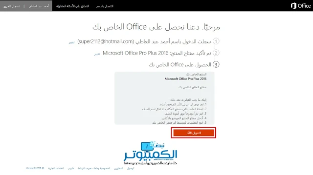 - اذا قمت بتحميل وثثبيت الاوفيس على جهازك يجب عليك القيام بتسجيل الدخول لحسابك بمايكروسوفت الذي قمت باضافة الترخيص به من خلال الاوفيس كي يتم تنشيط حسابك تلقائياً ، مع العلم انه ببعض الاحيان اذا كان لديك ترخيص Volume license سيتوجب عليك ادخال المفتاح مرة اخري من خلال اي برنامج اوفيس